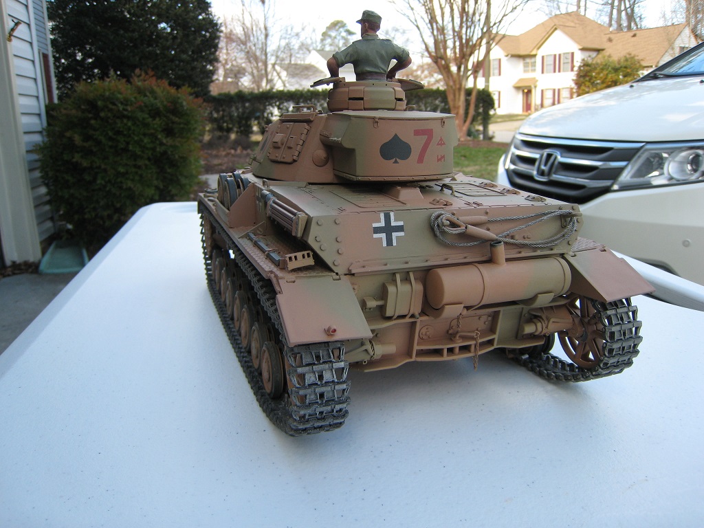 I think I’ve finished. I don’t know about the whole chalk-dusting-thing. I’ve given the entire tank a very light dusting using Tamiya’s Desert Yellow (XF-59). Basically, I used a mixture of 2:1:1 (Tamiya acrylic solvent : rubbing alcohol : paint) and then airbrushed it from about 12" away from the tank. It kept the overall color of the tank, but softened the color and the sharper contrasts of the pristine tools, rubber tires, machine gun barrels and markings.