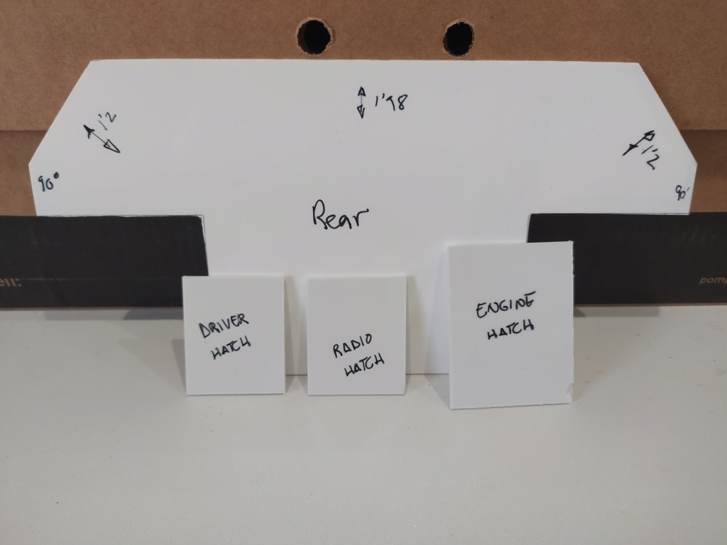 I cut the driver and radio operator hatches, enginge hatch, and the rear plate, ready for round and finish them. The Rear platae has a lot of bevels and it will take more time to finish:
