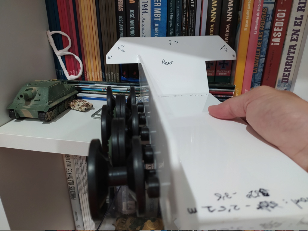 I cut the side hatches in 2mm styrene and one of the upper side: At forgebear I ordered this transmission covers for Panther G and looks good in the hull side. Compared with those of Heng Long: Size comparison VK vs Heng Long Panther: As I commented, I started the construction few months ago and there may be discrepancy between the uploaded photos and the current 3d model on onshape. This is the aspect of the entire model when I took the photos, with the gun barrel, muzzle break and an initial versión of the mantlet: