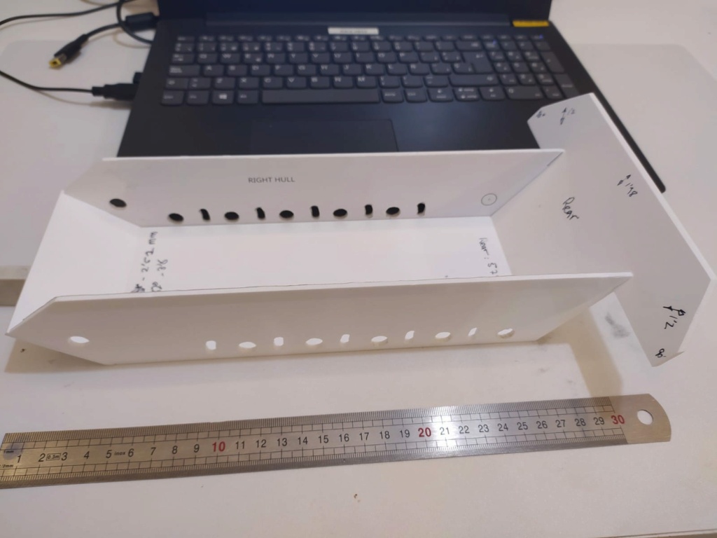 A small but very important step forward to face the final assembly of the hull, I have finally finished the rear plate that required so many bevels (3 in front and 3 behind). Some photos of the assembly without gluing: