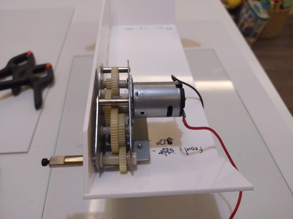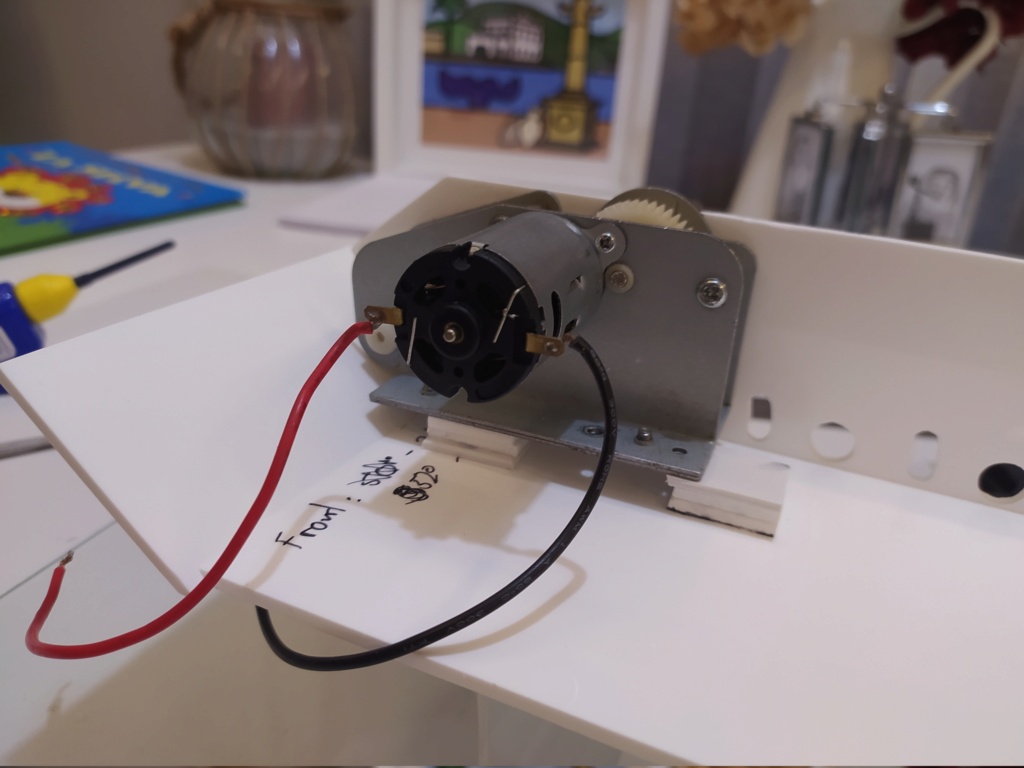 Lower front, right hull side and rear plate glued togheter. I also added a reinforcement at each corner: And this is how the right motor would look like: And as you can see I have very little space from side to side of the hull to place both engines, so much so that after much measuring and checking they will fit with just a couple of millimeters of separation in its closest part (marked in yellow in the next photo). If you look closely I had to bend out the motor terminals so that they do not "bother" the other motor: I could have reduced the distance between the motor and the inner face of the hull but that would have led to the shaft sticking out more than it should, messing up the whole wheel distribution and the idler. Remember that the running gear is based on the Heng Long Panther and the distance that the shaft protrude is the same as that model, 27 millimeters (outside of the hull - end of the axle).