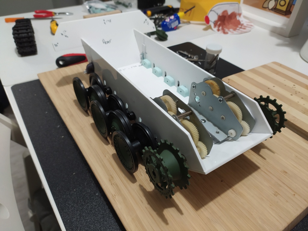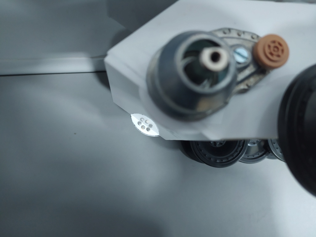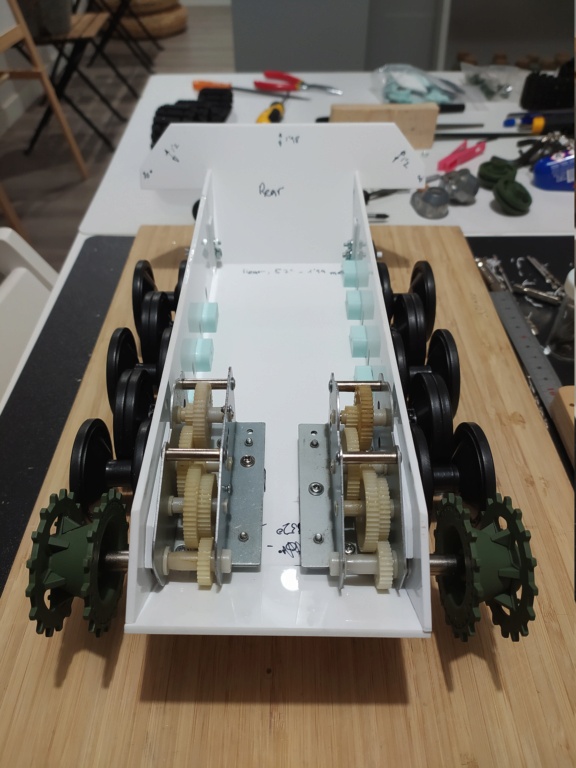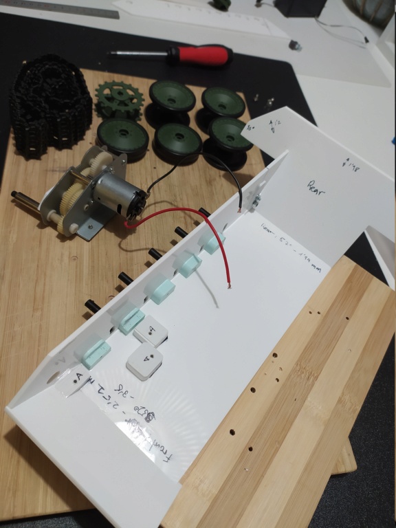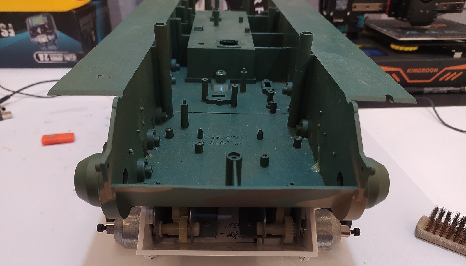 We had left the tank with the idler wheel supports ready, but with the left side of the hull unglued to have comfortable access and to test the right engine layout.