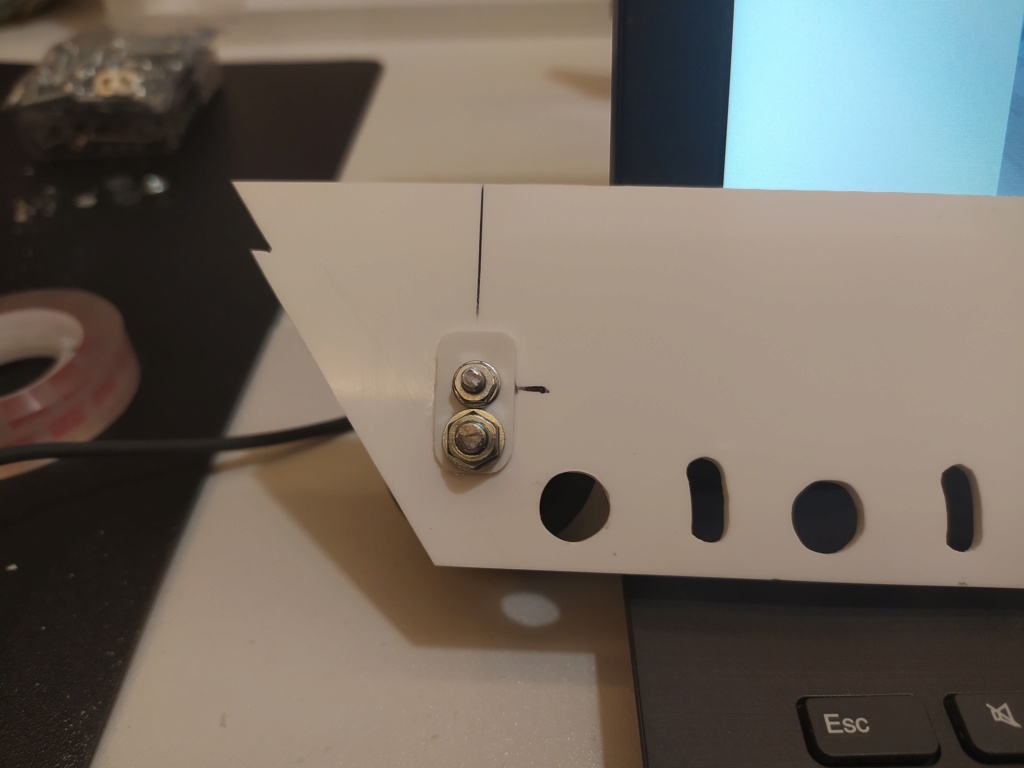 Detail of the transmission cover, fastened with m3 screw. The nut fits perfectly between the engine and the side of the hull, without interfering with the "filler" strip:
