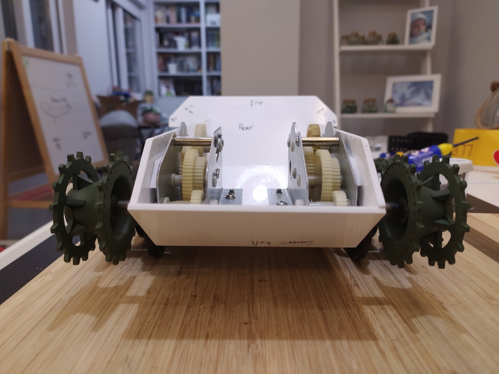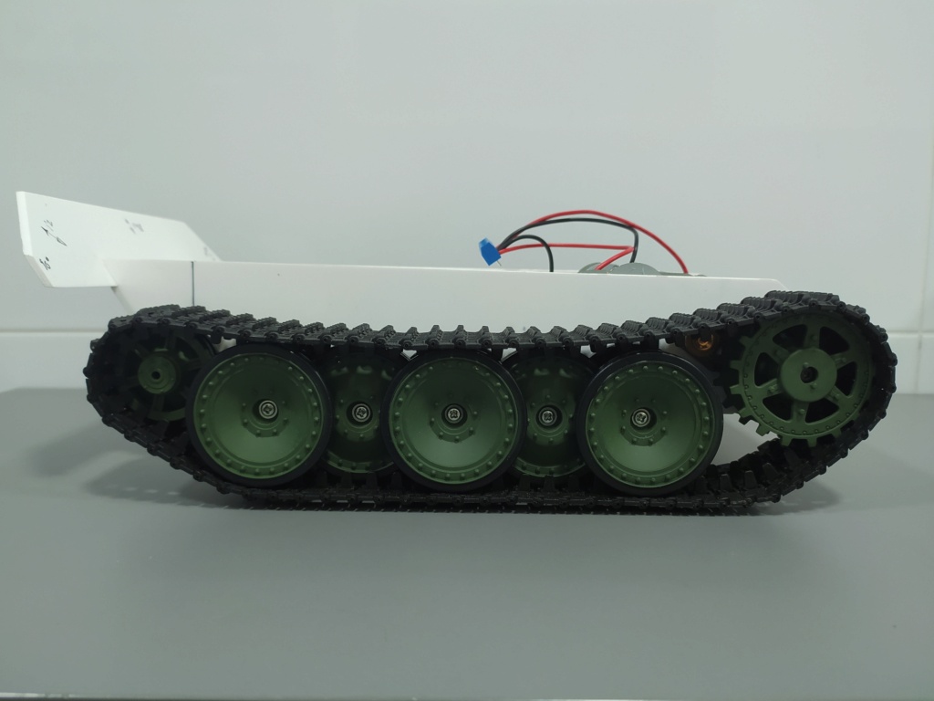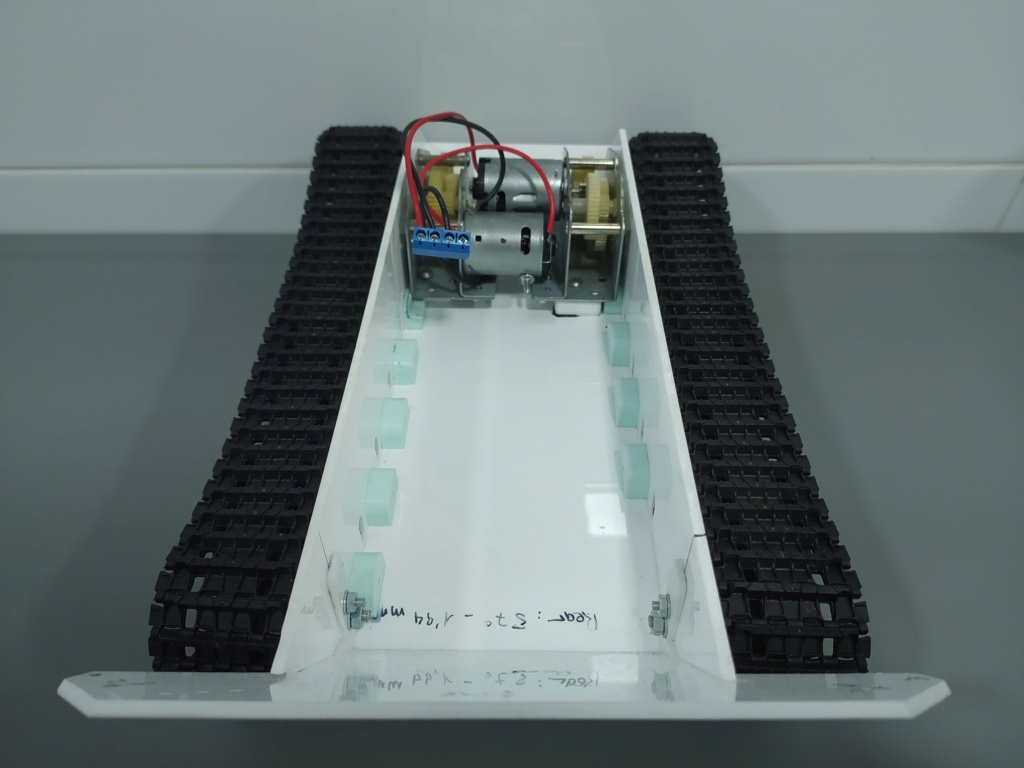 Once this was done, I glued the left side and all the arm supports on the same side, and built some shims for the left motor in the same way as for the other motor. As I mentioned in a previous post, the space between motors is very tight, so I had to mount first the gearboxes without motor, and then the motors themselves. Aspect of the hull without tracks and without motors, both sides finished: