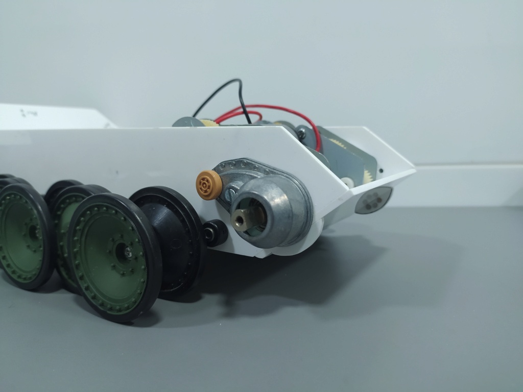 And why stick to that particular measure of 3 mm? as I said before, the position of the motors and suspension is copied from Heng Long panther and in this the shaft protrudes exactly 27 mm. Therefore the motor is positioned so that the axle protrudes those 27 mm, aligning the drive wheel with the rest of the wheels and the tensioner. If you take a long shaft gearbox, you will see that the axle protrudes exactly 33 mm, which taken to my design is: 3mm filling + 3mm styrene thickness + 27 mm shaft.