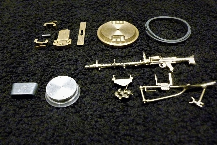 The Schumo Turret Vent and loader Periscope cover were in the original plan to install as was the Schumo MG34 on its AA mount. I managed to pick up the Brass opening escape hatch from RCTank.de. It will take a little working out how to install and some thought of what it should show looking inside but it will be a nice touch. Oh and the plastic grey Turret Hatch locating ring ?, thats also from Tamiya Tiger 1 Sprue F ( its also has the plastic Hatch Lid )