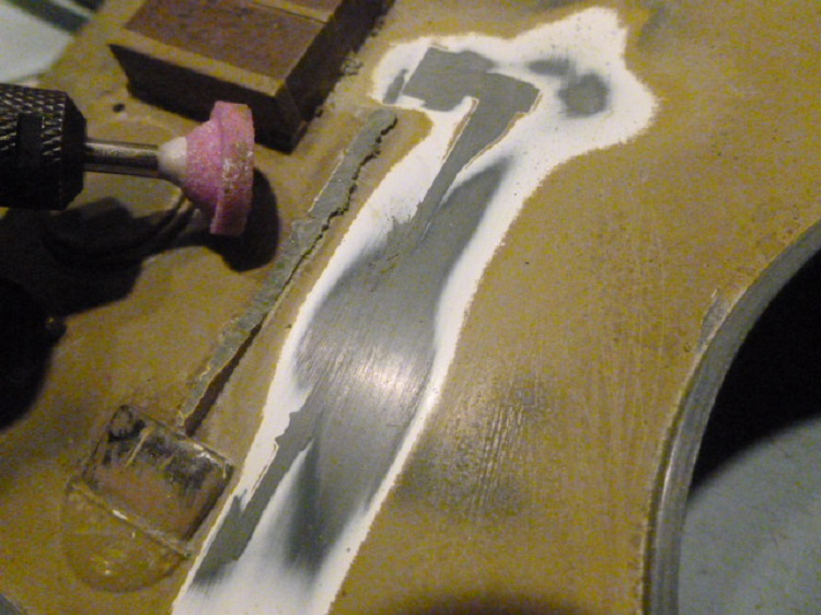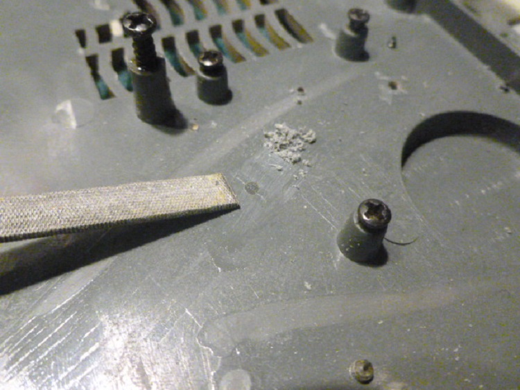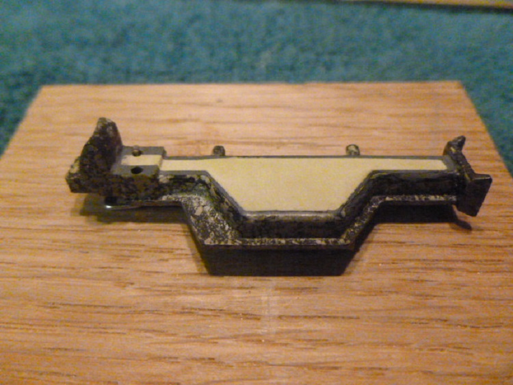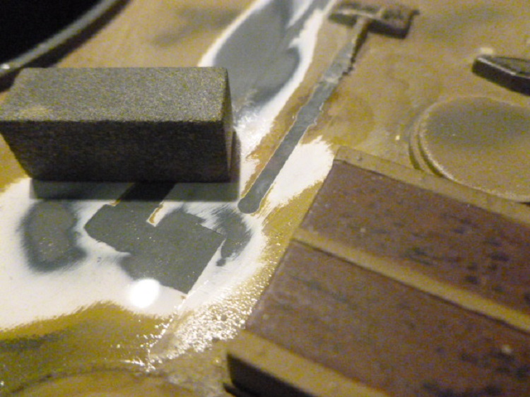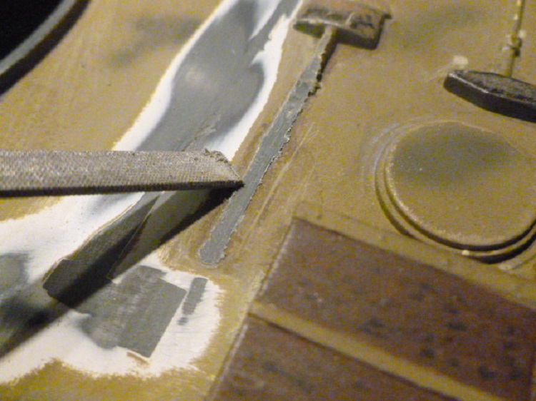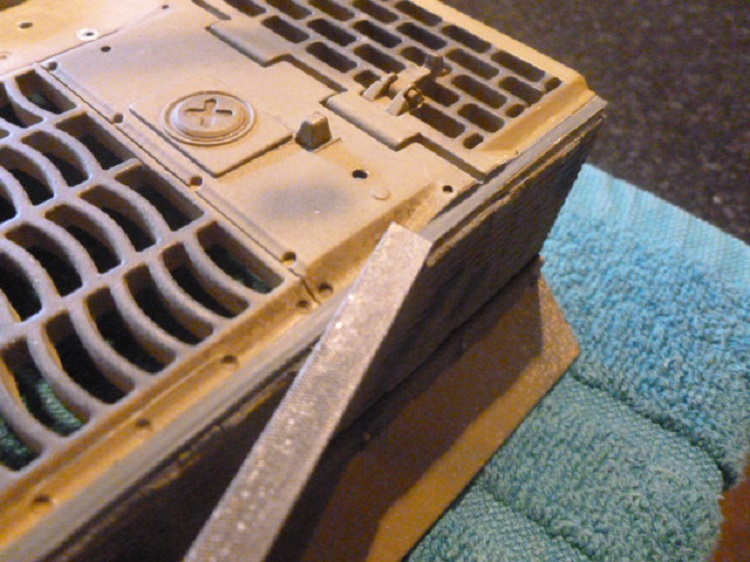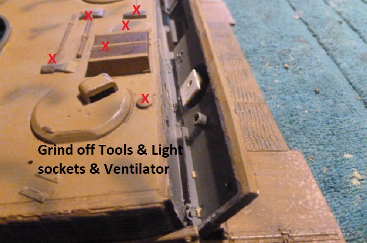 The tools on the early production Tiger's were relocated on the Mid Production variant , also by adding a second C hook next to the Jack block, the Jack block itself was moved further back. The two dummy light sockets on the standard HL hull also need to be removed and replace with a more central one. So I need to remove all the tools from the surface, some are simply fixed by glued lugs and some are moulded in. For removing the moulded on tools . I prefer to Dremmel off most of the tool leaving a millimeter or so left. Then with a fine file I scrape / file off the rest until the file starts to leave tell tale scratches on the surface One this happens I switch over to a small stone rubbing block that came with the Dremmel . This is used to "hone" the surface flat with water until with a wetted finger you can no longer feel anything other than a smooth surface . Several hours of "honing " later this is the result. It is very controlled and requires almost no filling. The Moulded on "wooden" jacking block and the compartment vent have been removed by Dremmel. The square area below the original jack block was patched with a styrene panel and will be filled with milliput