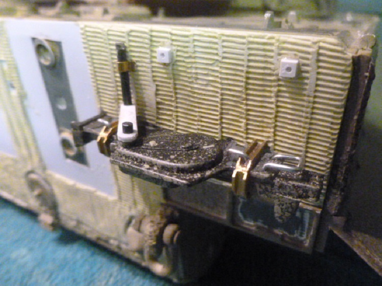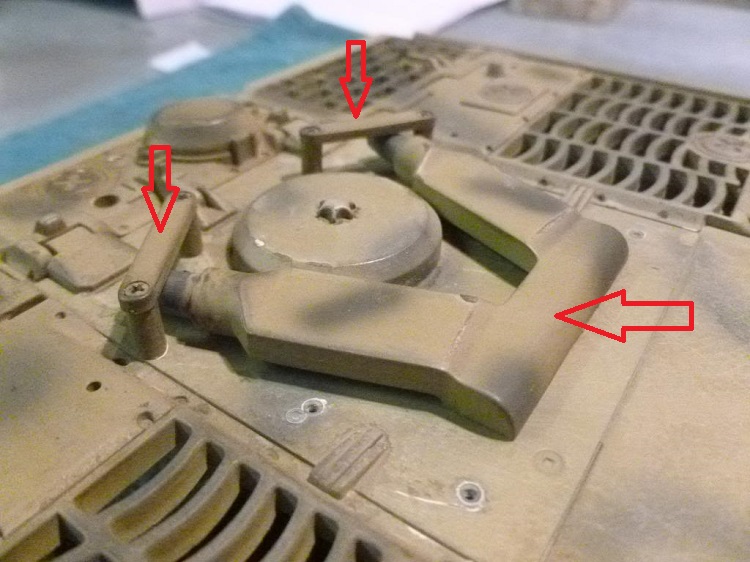 First on the List was removing the "extra" aerial tube mounted on the ( looking from the rear ) left hand side. Why HL added this must have been one of their anti copy right measures. Reading this forum I have learnt that this is wrong and needed correcting as it was only on the opposite side the tube was mounted . After using the Dremmel to remove most of the tube , the flat area's were carefully re-profiled using a fine file . While re-profiling the tube location , I used the same file to score a groove into the original weld line ready for some milliput beading. Next was removing the original early production Feifel air intake and brackets . I find the best way to remove these glued on peg mounted details is to use a file and remove most of the peg showing by scraping / filing it off . Then using a small pointed screwdriver , simply push on the head of the pin and it should "pop" out . This Mid / Late production air intake was added, while the Feifel air intake was discontinued from the factory spec beginning September 1943, It seems that it took several month and many combinations of old and new before this style of intake was standard by the time Tiger 131 was produced in Nov / Dec 43. The missing engine lifting handles broken off a long time ago were added using good old paper clips !
