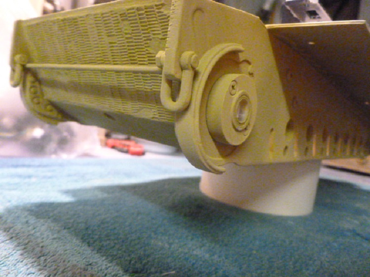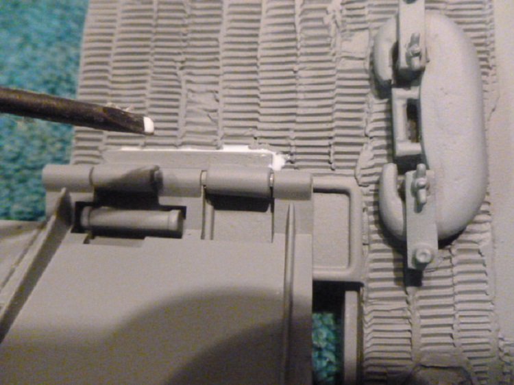 Ok, Heavy work load means not a lot done this week , slipping in a few hours in the garage I gave the rear panel a coat of Grey Automotive Cellulose primer. I prefer grey for the first coat as it highlights any errors or rough features like the seam line on the jack and the rough edges around the access hatch from the Milliput application, both were filed off and cleaned up. Looking at various photo's and reading Wolfgang Schneiders book Tiger in combat II, It would seem that the 1st Kompanie PzAbt 101 Tiger's displayed the Corps insignia on the left rear Hull. On the 1st and 3rd Kompanie the insignia was located onto a "cut out" panel where the Zimmerit was removed . At some time but until the decals turn up I will have to remove this area of Zimmerit with a file to replicate this feature. It is not clear if the 3rd company displayed the corps insignia on the rear as well ( Mentioned only on the front) its only meantioned that the 1st kompanie had them on right rear Hull and left front Hull . Unique to the 101st PzAbt was the form of a Tactical insignia for a tank company in the form of a Rhombus with the Latin S and a small 1 denoting the 1st kompanie. This was applied directly onto the Zimmerit One of the last items to be added to the rear panel were the missing rear mud flaps. These are metal ones from WDM. As these were added to the rear panel after the Zimmerit was applied, you can clearly see the join where the surfaces connect . A Simple tip I have learnt where any hard edge meets another surface and I want to blend them in, is to use some white PVA wood glue and a small screwdriver. Simply dip the small blade in the PVA and dip it along the seems, let it flow into the joint and it will blend those joints nicely. If you have any small holes you wish to fill it works for these too . Until the next post peoples.........Thanks for watching