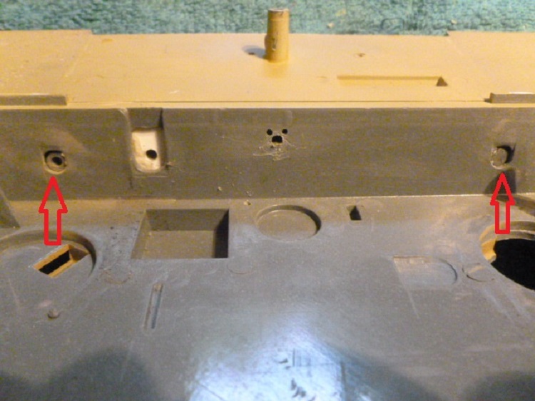 Next was removing the front Driver/ Gunner Glacia. This was done to make access for a Dremmel easier for removing the moulded on tools and opening the hatches on the hull as well as the Driver vision port. First I removed all traces of glue from these two lugs . Then by gently pushing the panel away and teasing it with small screwdrivers , working from one end to the other it eventualy popped off. The corners seem to have a lot of glue in place, ease these away with extreme care !