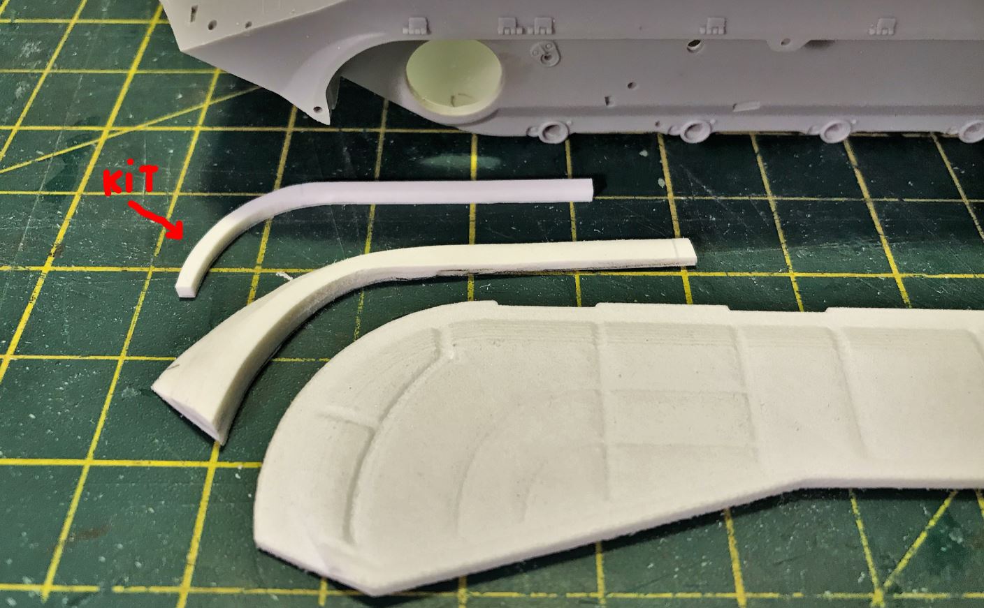 There is a shape at the front that is important to reproduce accurately because it is the base for the side skirts. The simplistic part provided with the kit (top) needs to be discarded and a new one (below) hand crafted using references.