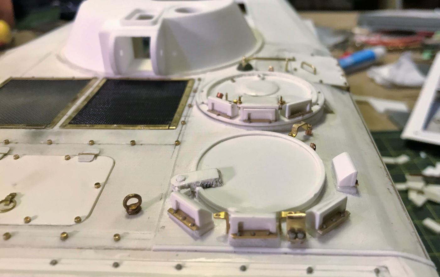 It is the brass job that takes a long time in order to dress up the cupolas and periscopes as per reference pictures, the Trumpeter 1/35 showing very few details in this area. Notice how better the crafted periscopes look compared to the Shapeways parts on the first picture.