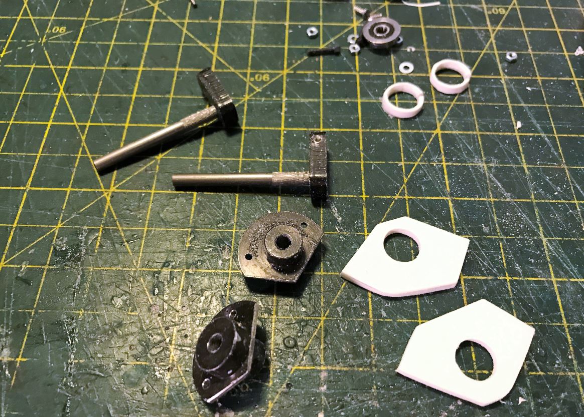Basic elements for the idler, with a flanged ball bearing at the center and an M4 metal pin as shaft.