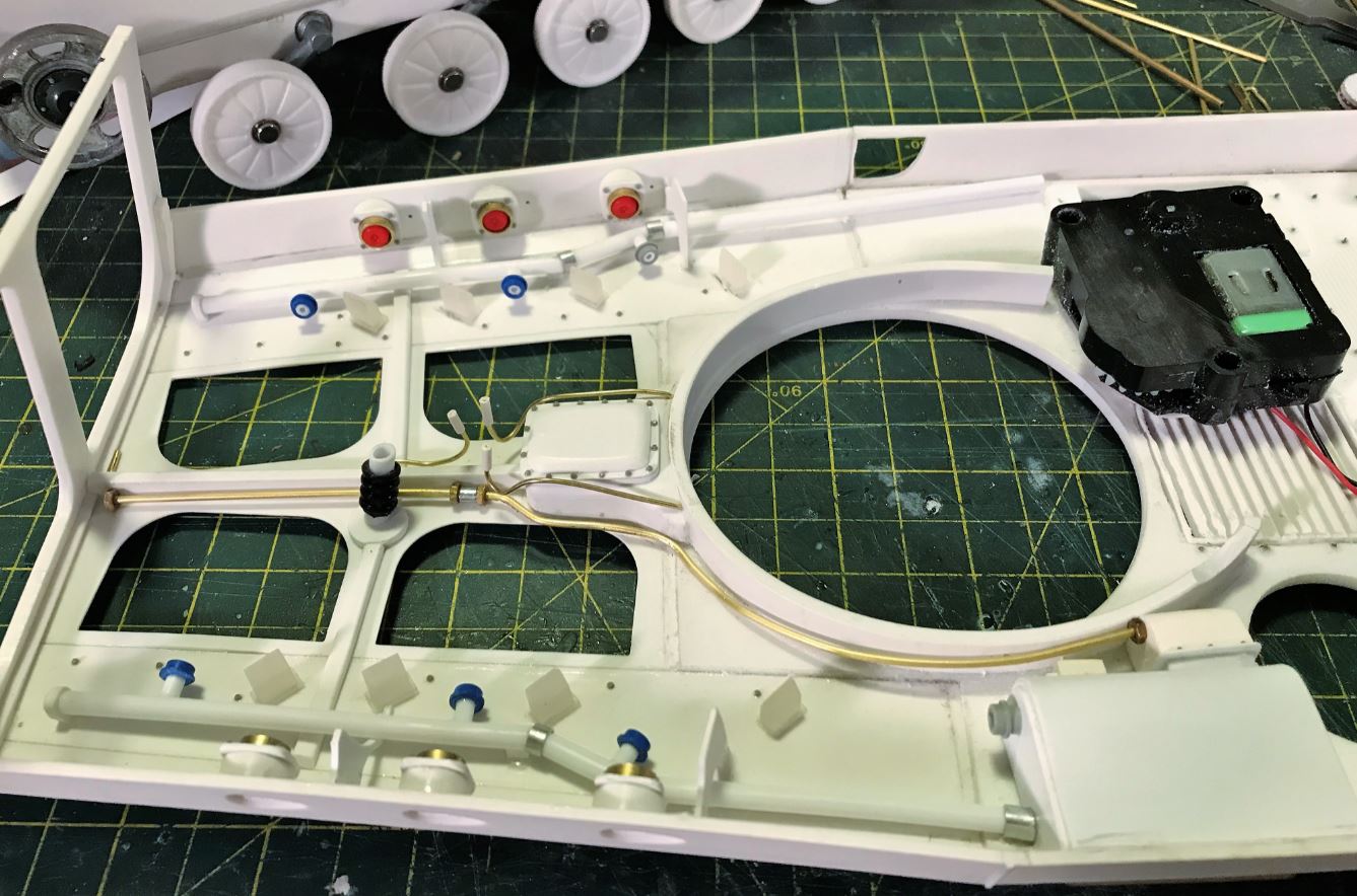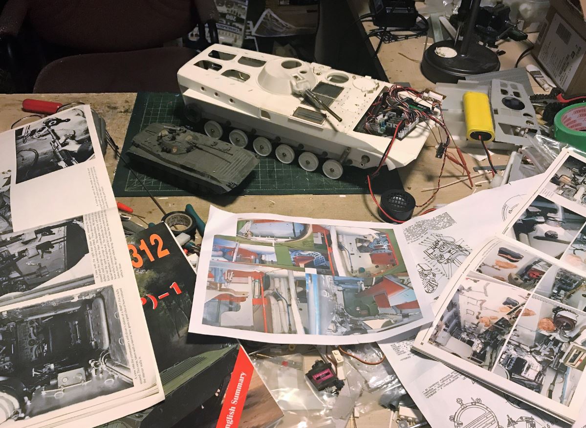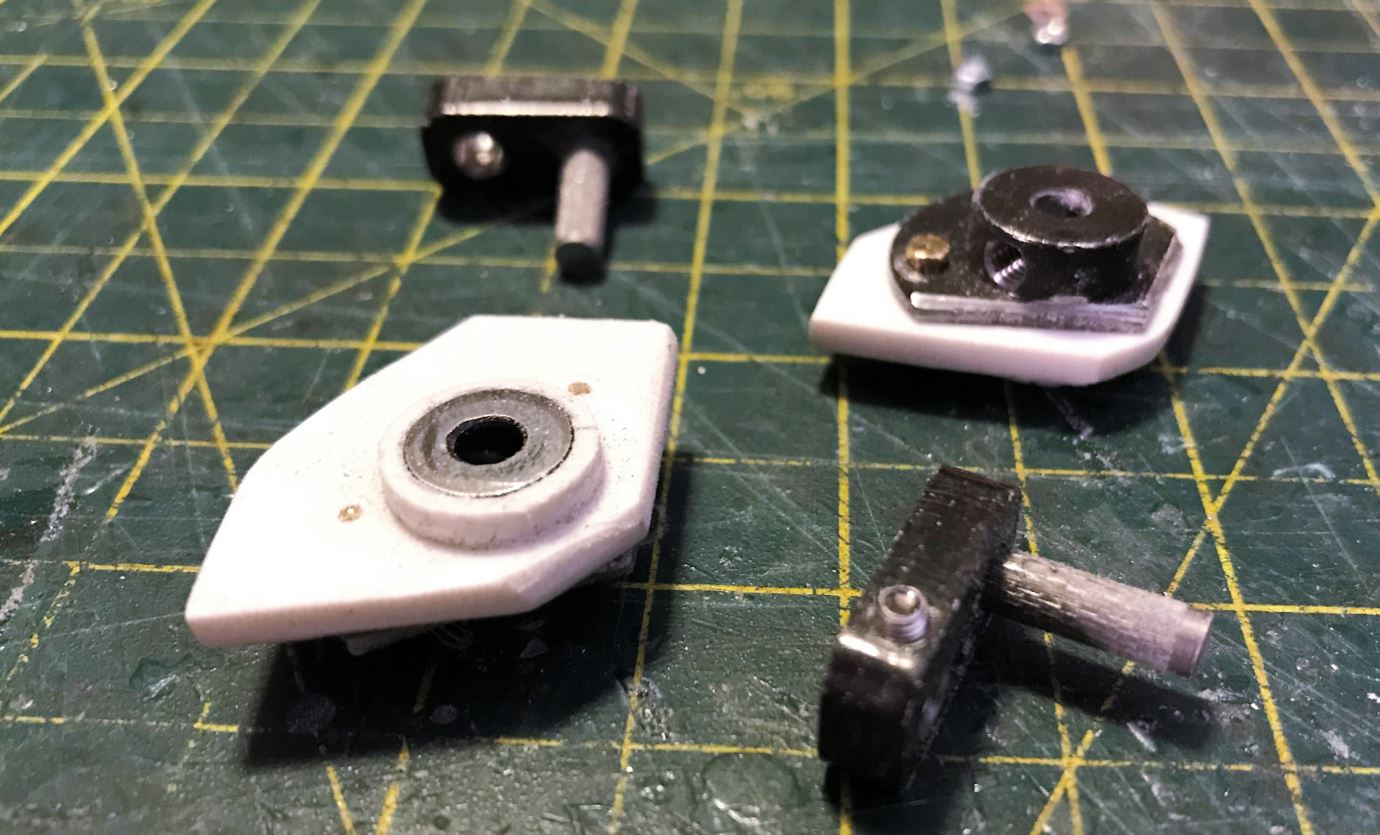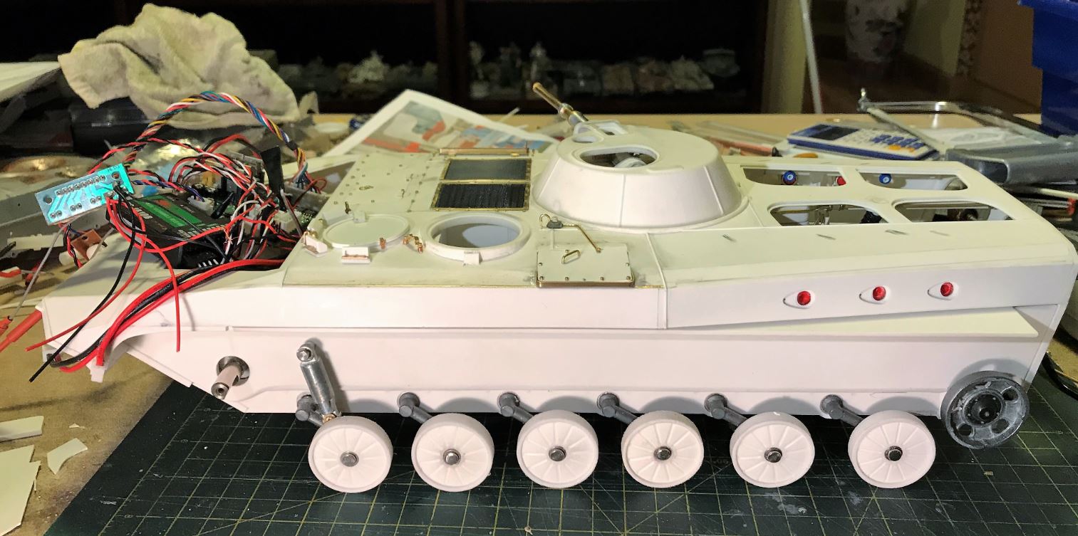 An HennTec Panther adjuster was modified to fit the BMP without taking too much room inside. The whole thing was cut in pieces. Plasticard spacers and reinforcement were created for the fit to the hull.