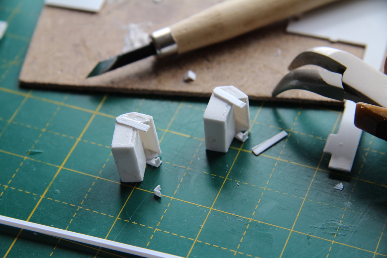 This is how I began getting hooked on the Tow hook creation: Now, to rough out the hook enclosure and pivot. I used my trusty mini sculpting curved router chisels for this: The problem with photographing styrene is that it's so white- really too white for proper white balance. Och well, it's always good to look on the bright side, so the saying goes.