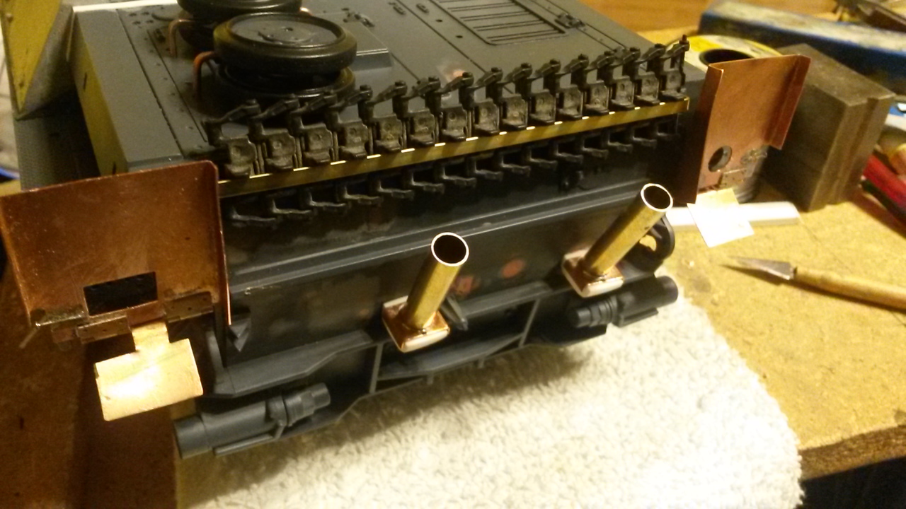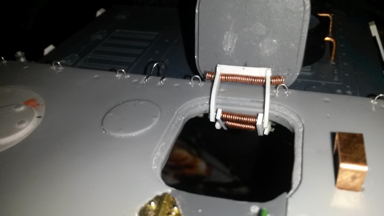 Got the springs on the rear fenders. Worked out the hinge problem. Had to add a couple of pivot points, but the thing will open and close now! Made up the mounts for the rear side armor plates. Last, but not least, here's a link to the video showing the barrel elevation in operation.
