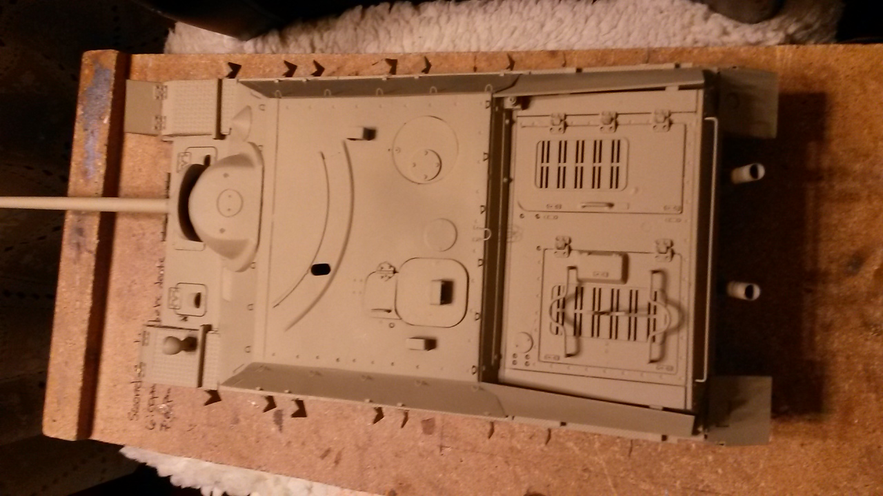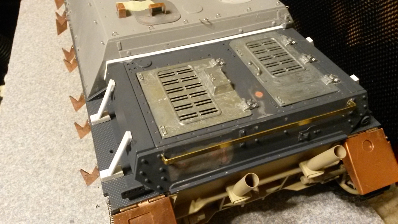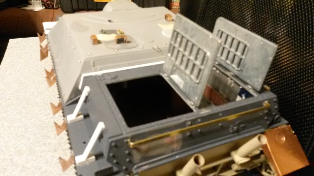 I made up schurzen mounts for the hull. Not sure yet if I'm going to do plates for it, or not. Many thanks to Herman for a care package from down under. Here's the hatches installed. This is actually the first set of these that I've installed that open correctly!