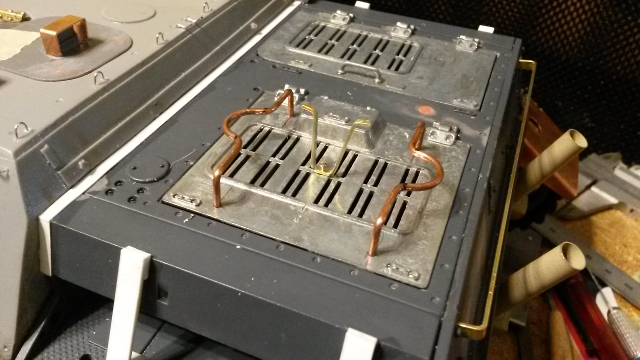 I made mounts for the spare road wheels out of some copper wire and got them mounted to the aft hatch.