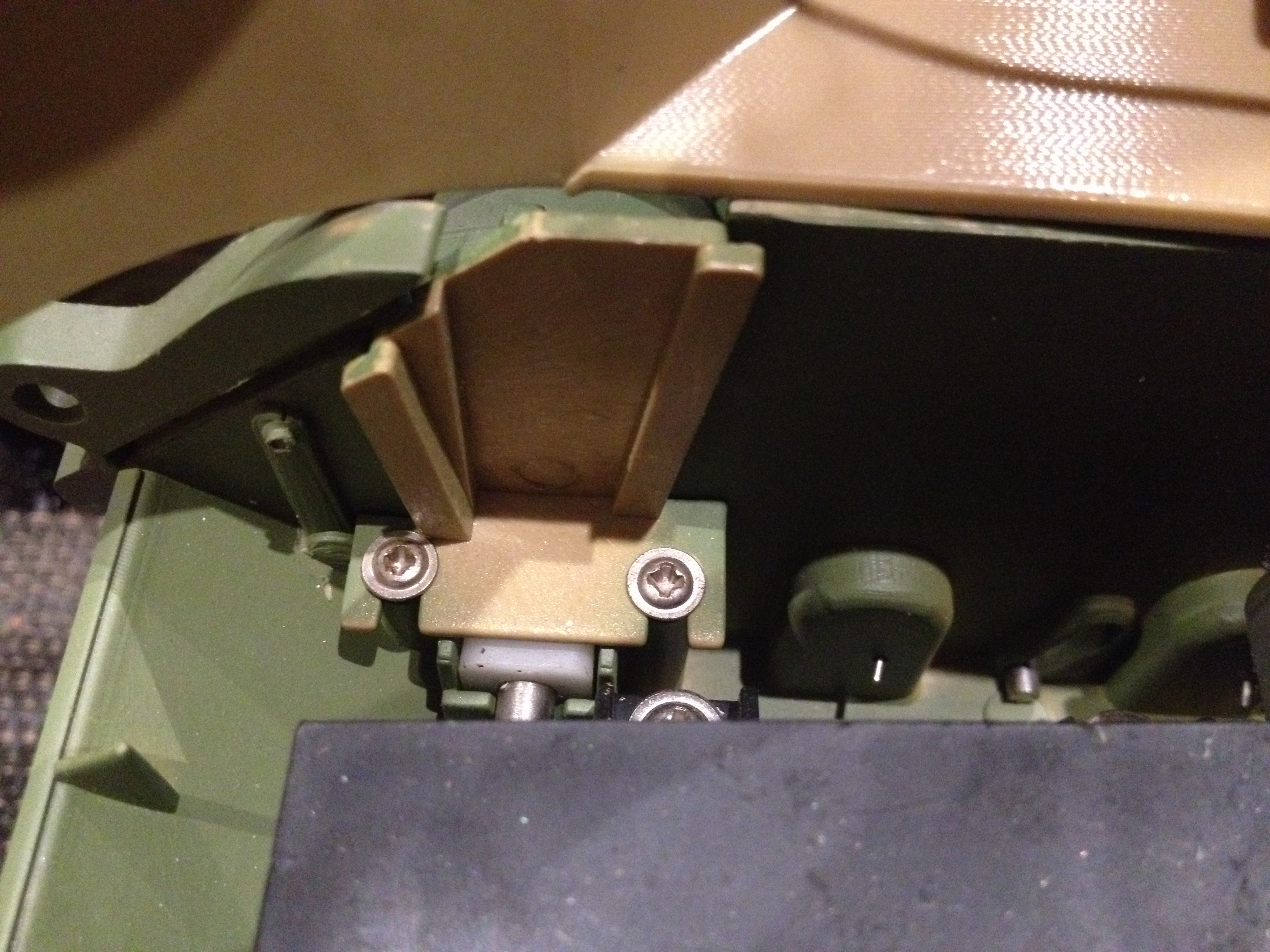 Gear set is encased inside a plastic housing that is set on moulded posts. The bulge in the lower glacis plate is there to accomodate this.