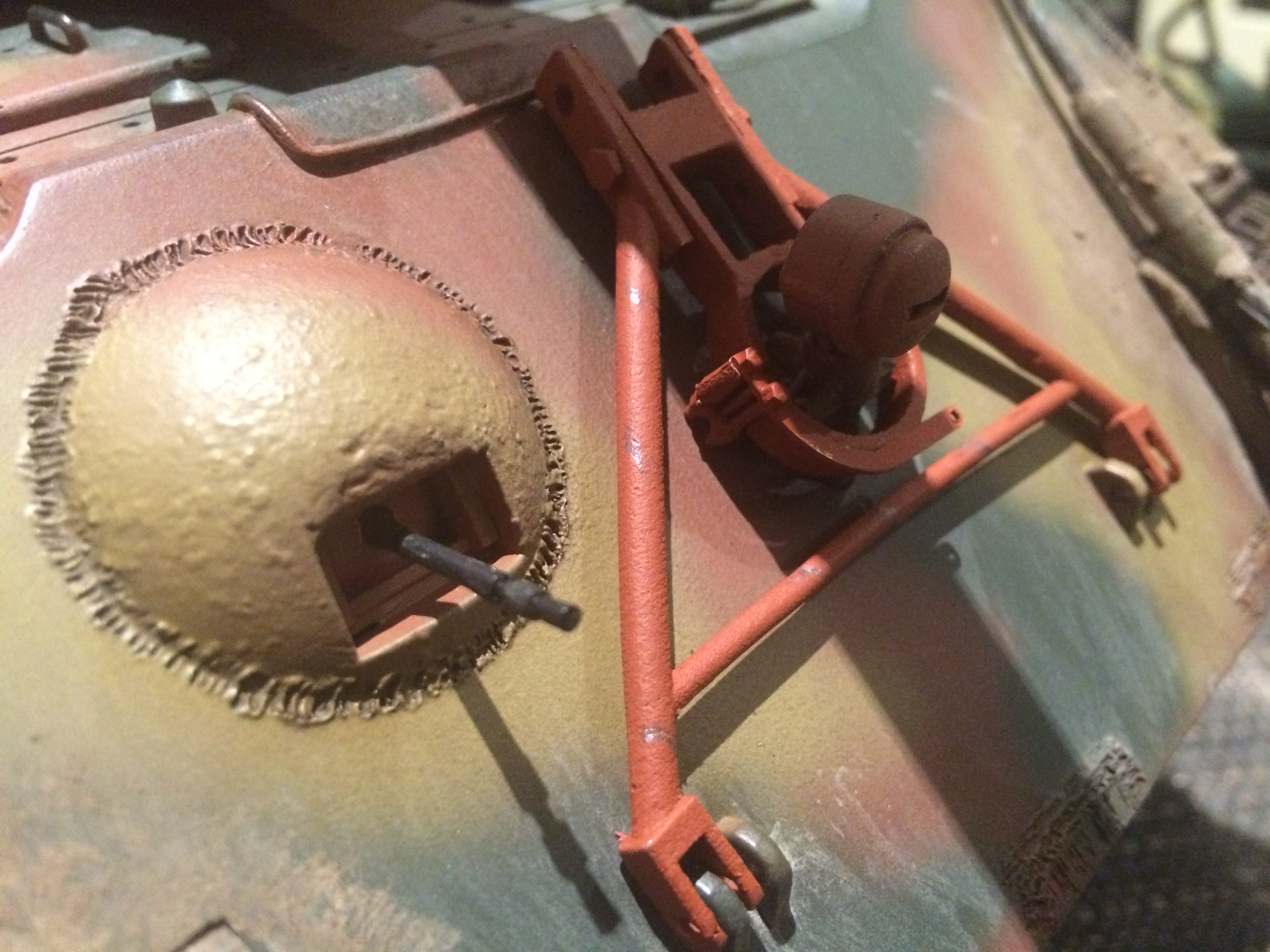 Tracks are on, tow cables, almost finished mounting the barrel support, and as I didn't want to wait for an Aber hull Mg, I dressed an HL cupola MG and cut it to fit my ball.