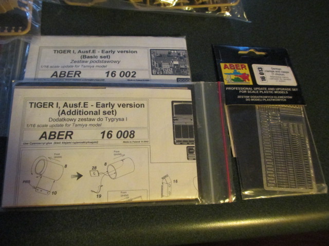 Ad Lav, thank you again! Good idea with those blocks there. Since the weekend's Convention was over and back to work, it was time to go back to the Tiger again. ( Only to come to a screeching halt as it is fiddly brass bits time ) I gave the Aber stuff a look over and read the instructions ( and compared their level of detail to the stock Tamiya parts ) and went right over to EBay and ordered solder paint in hypos as well as bending tools and a pair of lighted magnifiers for working close to the pieces. Once that material gets here, I'll go forward. I really want to use some of this Brass to dress up the tank in locations where it won't be lost the first time the terrain gets rough. I'll muddle around on other not so small stuff until then. Pics: