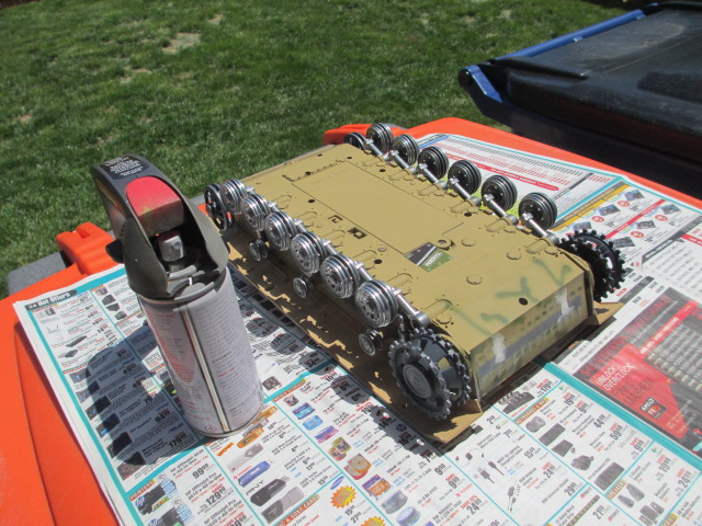 *Click* Instant Summertime...Today was perfect for painting so the lower was set out and Model Masters Panzer Grau applied in a couple of deep coats. Tonight, I looked it over and touched up spots with a small brush. That's going to be an ongoing thing til' weathering while building this StuG in phases. I had some time left and mounted the Continental rubber back on. I am pleased with the progress today. Pics: