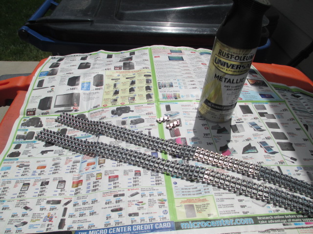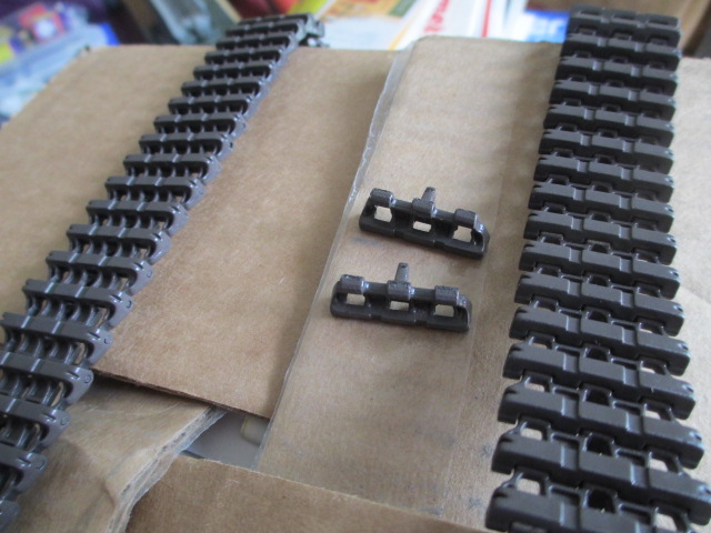 Another sunny Lunch hour today so I took it as a good time to paint the new tracks. After a thorough wipe down, I laid them out and used some of the 'oil rubbed bronze' enamel on the interior run and 'root brown' on the exterior and chevrons to do two coats. Again, pretty simple work. I was really impressed with these tracks and their heft and detail. They will look great with a little wear on the chevrons and some weathering from Tamiya. Pics: