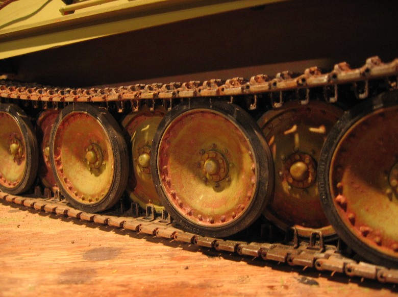 The arms are adjusted with an extra 45-50 degree arc from the normal position for the two arms at front and rear(which puts the Tammy wheel arms beyond the arm locks when tracks ore off...so that can be a pain when you have to put the tracks on), and the middle arms are about 30 degrees beyond normal positon. Some filing of torsion rod locks was necessary for the motor clearance up front. Unfortunately, all my posted detail pics of arm installation are on the old site.
