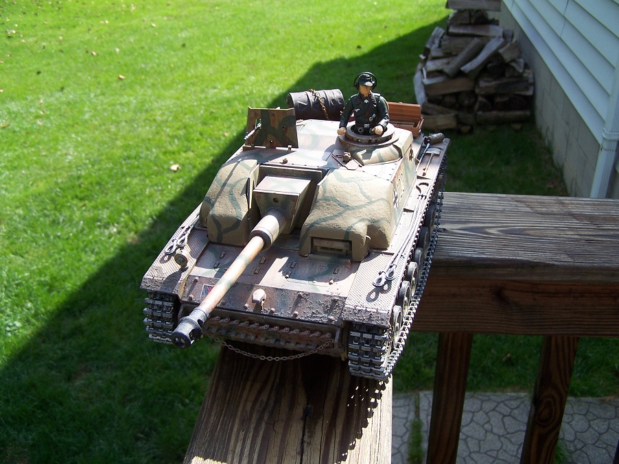 Here are a few photos of my HL Stug III with field modifications. The Stug is IR, metal chassis, tracks, transmissions, with all road wheels. Plan on adding Clark TK22 in the near future. Hope you enjoy the photos.