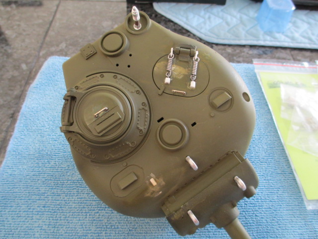 36th Day: Evening, Alpha. Yes indeed, I could not agree more. I love those Schumo type kits and enjoy the level of realism that they add but there is something to said for the sense of satisfaction you get when you build a piece yourself. Today was a turret day. I finished the Loader hatch springs by adding the nuts on the hatch mount points. I made them out of a 1/35 Tiger 1 tow shackle. The rest of the afternoon was spent adding the excellent Schumo turret upgrade kit and completing the searchlight mount. There is a little more to do, adding the mantlet canvas cover clasps and putting a periscope on the Commander's Hatch. I'm looking for pictures to see if that hatch and the gunner's periscope in front of it had a periscope protection cage mounted on it. Then the .50 cal I am using will need a rework. Pictures: