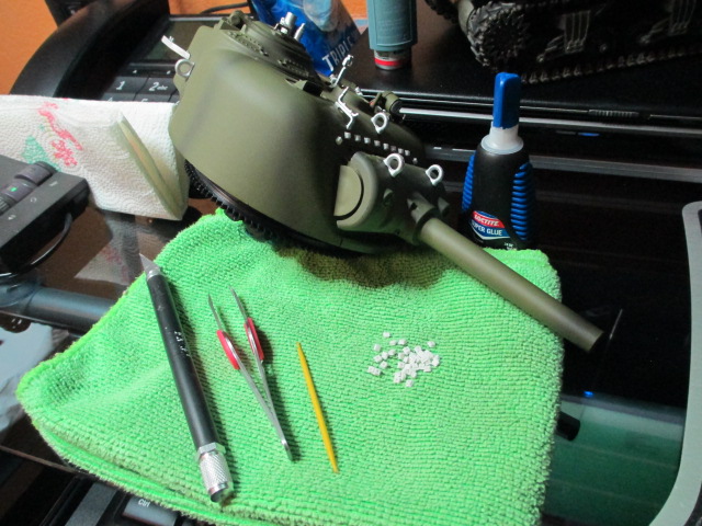 38th Day: First off, finished up the Mantlet canvas cover clasps. With them completed, the rest of the turret is sugar. I drilled out the Mantlet .30 cal just for fun. Briefly considered lighting it with the LED on the other side of the Mantlet then decided not to push my luck. If I get the Searchlight to light up with the headlights, I'll consider it golden. I'm awaiting some periscope parts, kindly sent so will set the turret aside for now. It is 98% complete as it sits. Pictures: