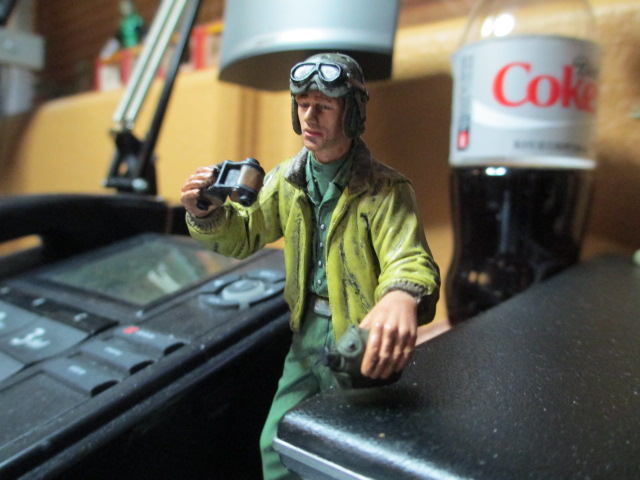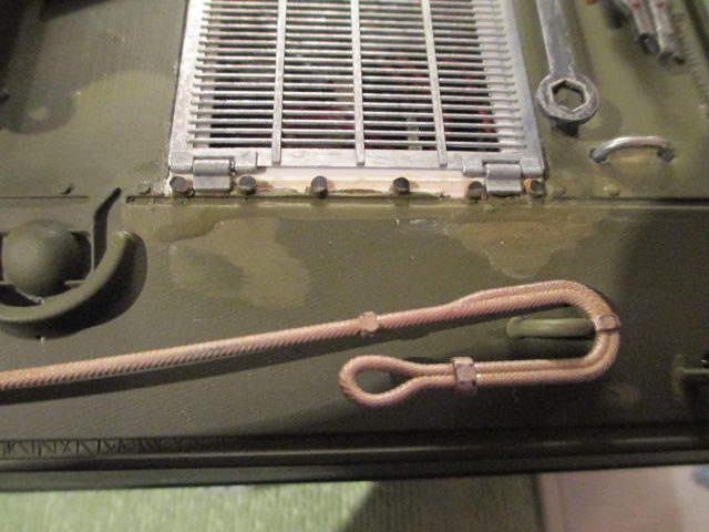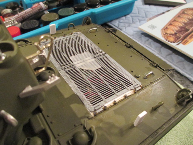 66th Day: Alpha, everyday is an adventure with a complex Build. I notice that your Sherman is looking grand in a fresh coat of O.D. tonight. ;o) Got a little research material for my next build in the mail today. It will prove useful and instructive reading. Sherman-wise, tonight was a cruise night compared to the tough going the last couple of days. I added the tools temporarily to see how the Engine Door rests would fit. I finally found a picture on the Sherman Minutia site to verify that HL did indeed place the tools correctly. I ground down flat the LED that forms the warning light for the gun firing in the Gun Shield Telescope aperture. I was going to make the neat armored slide cover for that scope then noticed that this part did not get added to the shield until late 1945. The LED in the scope mount is smooth and black looking now so I was pleased to get that much done to it. I finished up the night by doing some wire management under the rear deck. I also painted the tail light leads under there O.D. since they are exposed behind the rear bulkhead. I put a piece of clear acetate tape over them as well on each side to help hold them securely in place and add another layer of protection. The last thing I did was remove the black devil eyebrows my tank commander had been given by some tired Chinese fellow. I gave him a pair of regulation flat brown ones. A canteen for his empty hand was added until I can source a nice 1/16 map for him to be perusing. Pics: