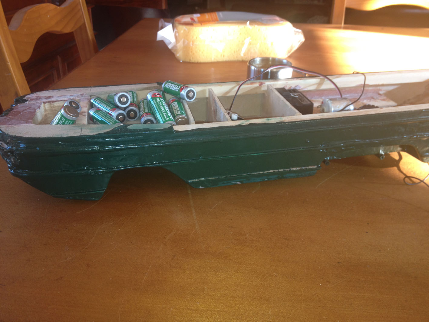 mesued up the funny we reah hatch thing and guled in place i then set about cutting out a place for the bateries to sit and or lighten the whole thing a bit make it up as i go along DUKW meet plunge router more coming soon