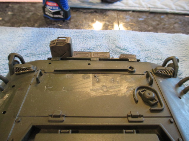 No post thrills today but I was able to locate a progressive smoker, tubes and on \off switch and get that ordered. It should work fine with the Mato M4A1 as there is space and a slot for the missing on\off switch for it. Tonight, I added some Schumo vent grills for the hoods on the back deck. I had them set back for this tank from some time ago. After that, I removed the oversized guards and lift hooks from the upper hull and deck. Cutting a piece of tubing provided the mount for the massive idler adjustment wrench. I may drill and pin it, depends on how detail crazy I feel by paint time. Pictures:
