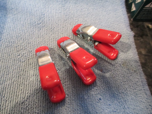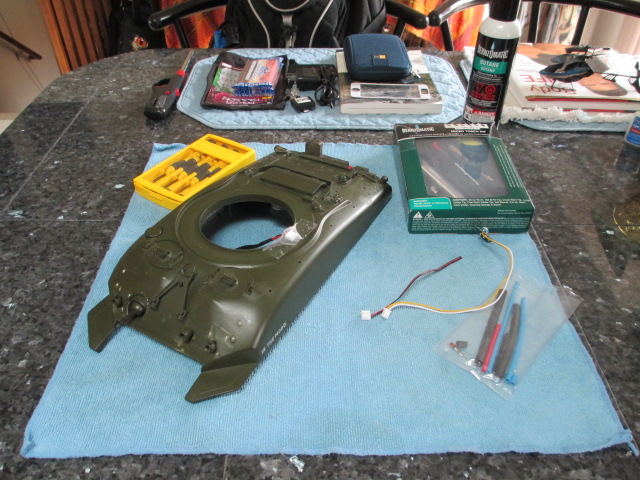 Alpha, no problem, I'll post a picture once I have it all working. A neat find, some small metal clamps, always a useful item in a hobby box. 3 for a dollar at the local grocers. Friday and Saturday were very busy but I managed to set some time aside this afternoon to work on the upper hull wiring. I soldered the wires for the turret rotation gearbox on first. I was going to wire the new sound pot up since I had verified that to turn it into a two pin rheostat type pot, I needed to connect the #1 pole and the #2 pole (the wiper) into one pin then use the third pin as the ground. Walking into the kitchen, the email blipped and it was Curtis from Immortal Hobbies saying that they would have a schematic in a day or so to safely use their sound pot on the Mato 2.4GHz board. I'm going to wait to wire up the pot until I see what they are sending. No rush. Next, I configured the existing wiring for the headlights and taillights from a three pin to a four pin using a good picture of the wiring and Alphas notes from sending me the bridge board that was needed to make the new set work. Finishing up, I plugged everything in and put in a good battery. Flipped the switch, ...nothing. *chuckles* I tried a second battery, ...nothing. Checking all the connections brought the issue to light. Swapping the 2.4GHz board from hull to hull necessitates pulling the pins from the big battery plug. When I had put everything back together in the old hull, I had not seated the ground pin properly in that plug. A quick push and the pin snapped into place. I hooked up the first battery again and flipped the switch. The M4A1 rumbled to life. I have to admit, the new speaker and sounds are better than the older one. Everything worked, except predictably, the headlights, taillights and bow MG. The new airgun worked fine, the LED for firing lighting up the mantlet .30 cal. ;o) Turret rotation and gun elevation, tracks, all work, just those lights and the bow mg LED. I had to cut and solder several lengths of wire to get the lengths needed to reach the plug but I think the issue is that the wires at the lights need to be unsoldered and the whole thing reconfigured at the lights to match the 2.4 layout. I had redone the wires at the plug but not at the lights themselves. Tomorrow, I will get some new wires in single lengths and redo all of it, including removing the resistors which the 2.4 layout do not have. Pictures: