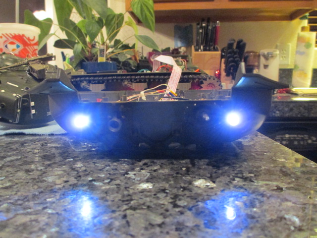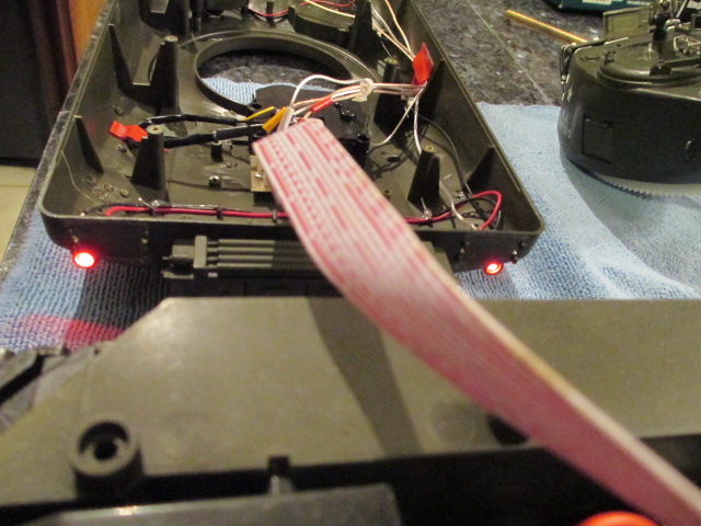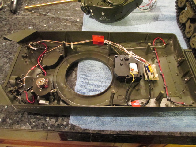 Alpha! Nice Surprise! Your new Saunders Sherman is looking fantastic. So, today, some 24 gauge wire, some colored electrical tape and a massive soldering job later, the M4A1 has lights and a working bow MG. To begin with, I took close up shots of all the connections at the lights (after removing a ton of hardened hot glue) and compared them with the blow up of the picture of the underside of the upper hull of the 2.4 GHz version that Canned Heat found. I saw the issue right away, switched hots and grounds on the new version. I cut all of the solder job from the previous day off as well as the capacitors and rewired the four pin connection again carefully. I hooked up the battery and cable and flipped the switch. Working Lights! ... No Bow MG. Double checked the new wires and connections, still a no-go. On the off chance that Mato had switched the hot and ground of the LED by inserting it upside down crossed my mind so I snipped the just done connections there and twisted a new set on to test. Working bow MG! A quick resolder and that was done. Not wanting to mess with a good thing now that everything was working, I left the sound pot alone again (still no schematic email from Immortal) and organized and secured the newly soldered connections with DS Tape, a couple of wire ties and a little rubber cement. Feeling better about the build again. Pictures: