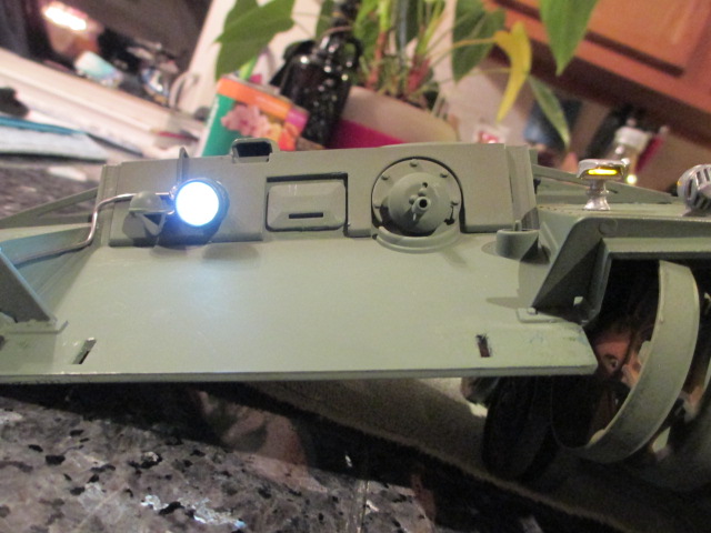 Alpha, I would have only attempted that with a smaller drill bit and under my magnifier because those last couple of holes were way off. ;o) Smart on me to have gone with some Tamiya mesh. Tonight I assembled, mounted and connected the NOTEK light. As a guy who approaches soldering with the same trepidation as if the hot iron was going to be applied to my bare skin, I was understandably cheered when I plugged the battery and connections in and flipped on the power. Pics can tell the tale: