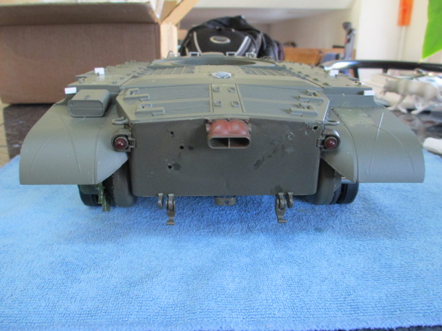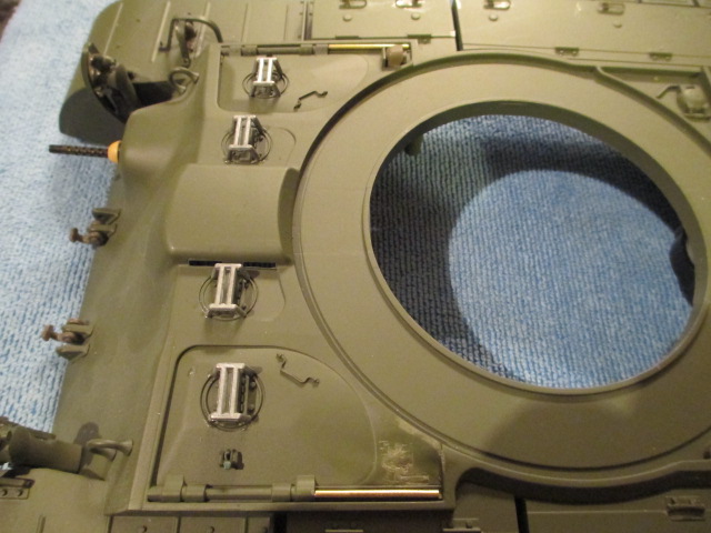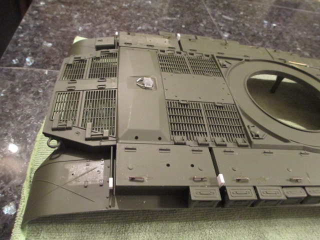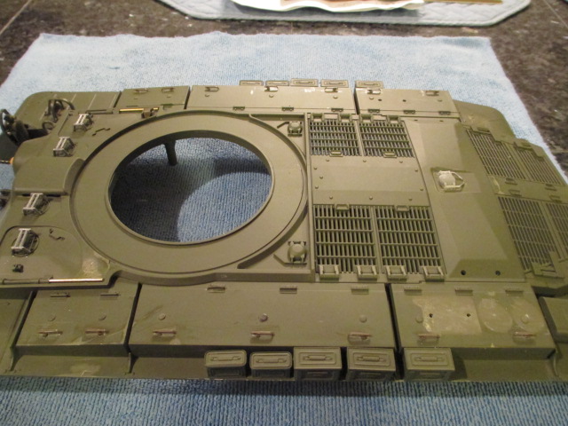 I will finish building this beautiful kit, Alpha and use it as a research tool for a Taigen Stug. *bows* Thank you, my Friend. For work, I backed and filled the upper deck mounting holes and discovered that HL has made a couple of changes over the intervening years in their Pershing. Doing a test fit, I saw that the single central mount in the rear between the gearboxes turned into dual mounts on the new upper. I sawed and sanded them away and did the test fit. Six screws will see the two hulls mated as well as seven ( or eight ) ever did. Finishing up, I drilled as small a hole as possible in the caps on the front road wheels and removed them with a phillips head driver. Going to removable caps on their road wheels was one of the best changes HL ever did, that and dropping the use of push rivets to hold suspension arms in place. The new metal arms use hex screws. Now, I need to order two more of the metal wheels and once all are mounted, they will balance the weight of the gearboxes in back pretty well. Pics: