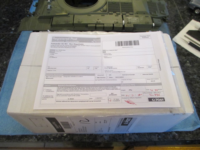 Great day for the Post! It's like time stepped forward and delivered the metal idlers and suspensions as well as Alpha's unique turned brass barrel, buckets, 8 pin cable and a Tamiya 1/35 Stug