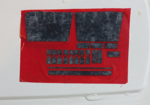 What you have now done is sealed the back of the brass with rubber. Etchant does not eat rubber so the area of brass that will become our parts is isolated. This also removes the need for frets, so you do not have to trim the parts. Your parts will be on the rubber. Trust me they are not going anywhere.