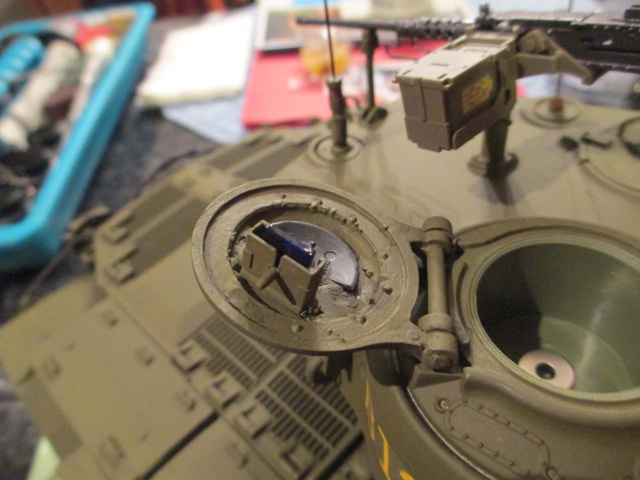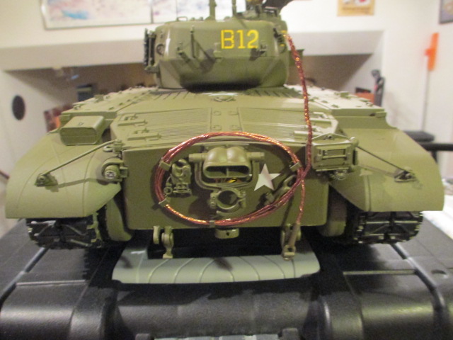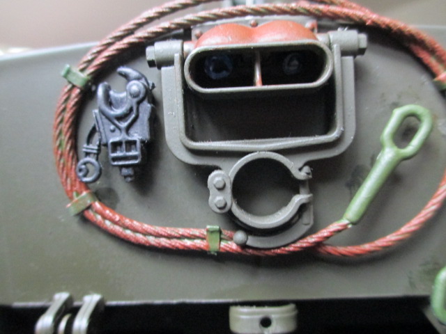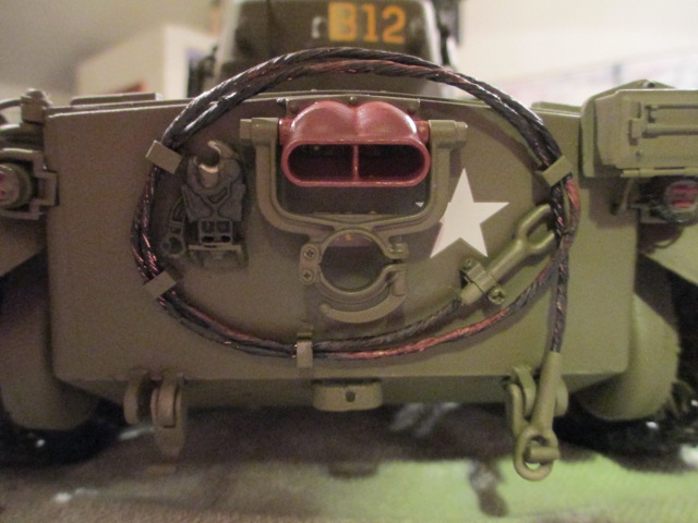 Tonight saw the tow cable wound and assembled and painted. I did a little more detail painting on the rear plate pieces and the medical kit and turret antennas. More to do but the eyes decided to call it a night. Getting close to stowage and weathering. Pictures: