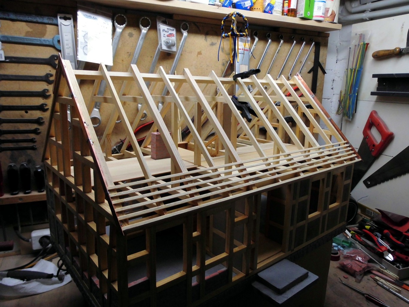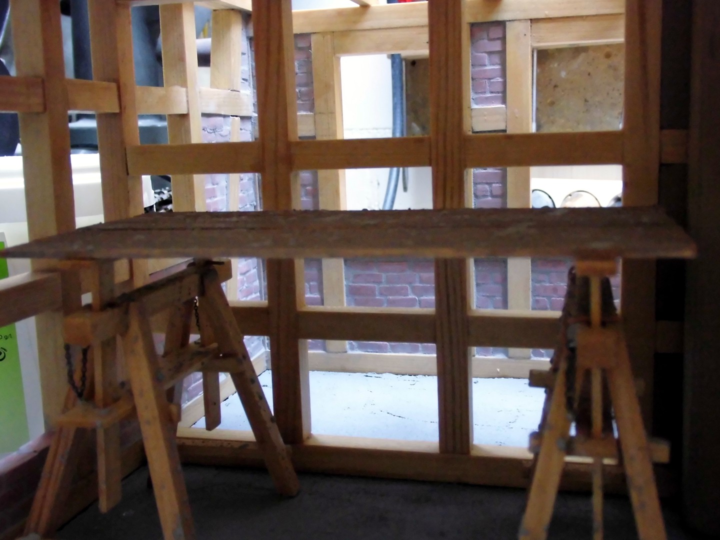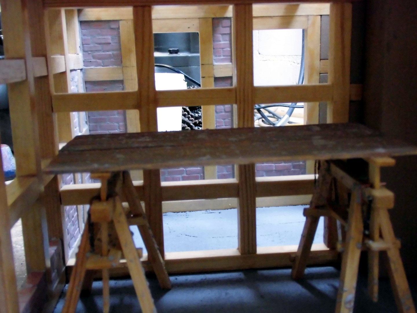 It's going to the end - not with me but with the house; the dioramas small parts were aged somewhat and brought into position. Here are the scaffold jacks in the ground floor...