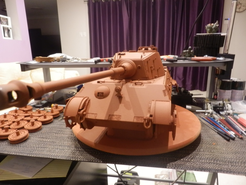 Ran the red primer over all the new additions while steering the turret with my foot(controler on the ground) so that no paint would settle in patches.