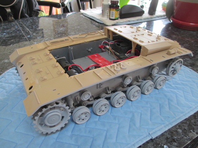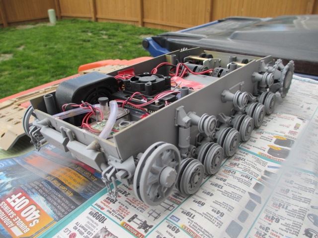 *Click* Instant Summertime...Today was perfect for painting so the lower was set out and Model Masters Panzer Grau applied in a couple of deep coats. Tonight, I looked it over and touched up spots with a small brush. That's going to be an ongoing thing til' weathering while building this StuG in phases. I had some time left and mounted the Continental rubber back on. I am pleased with the progress today. Pics: