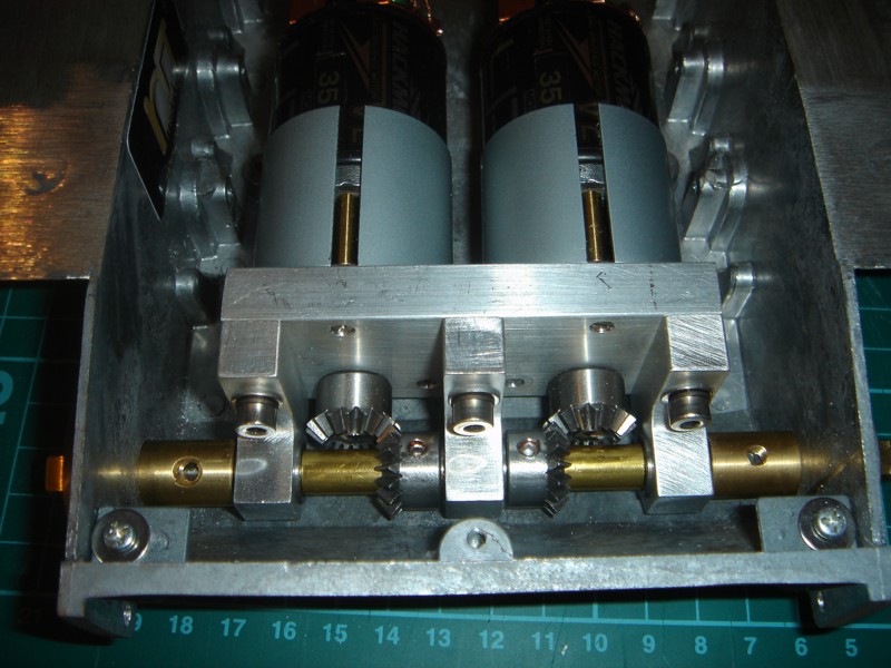 Here is a closeup of the reamed hole... the motor had the side L section aluminium mounting plates removed and was put into the hull and the brass bushes added.