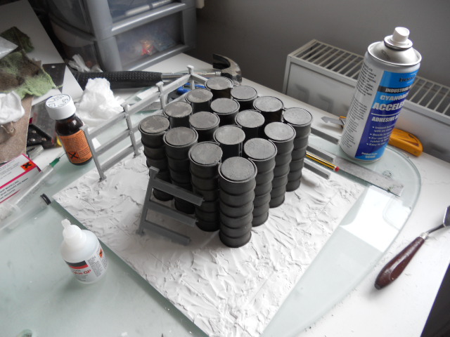 Seeing as I was on a roll, and already had oil drums printed, I decided to complete the setting and am in the process of creating a fenced off fuel dump, which will have a camo net over it. I am trying to make it tank proof, using superglue and plastic weld to hold the fence together...it will probably last ooooohhhhh....3 minutes??