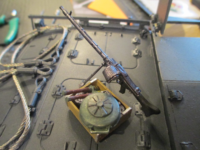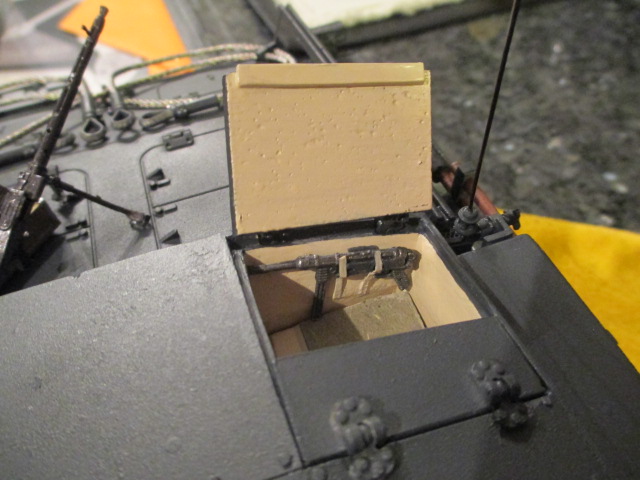 Took some time this evening to do a little more of the detail work. I found a home for the MG34 and Box O' Goodies and placed them using the 3M removable clear DS Tape. After that, I prepped and mounted the side grab handles up front. A little brass stock and using the Mark One eyeball, saw the rear casemate handles in place. Running short on time, I bent up some quick clip mounts out of flat brass and put the Commander's MP 40 in place in his hatch. It is not quite in the right place but needs must on RC tanks sometimes. A touch of paint to finish and some more detailing for tomorrow night. Pictures: