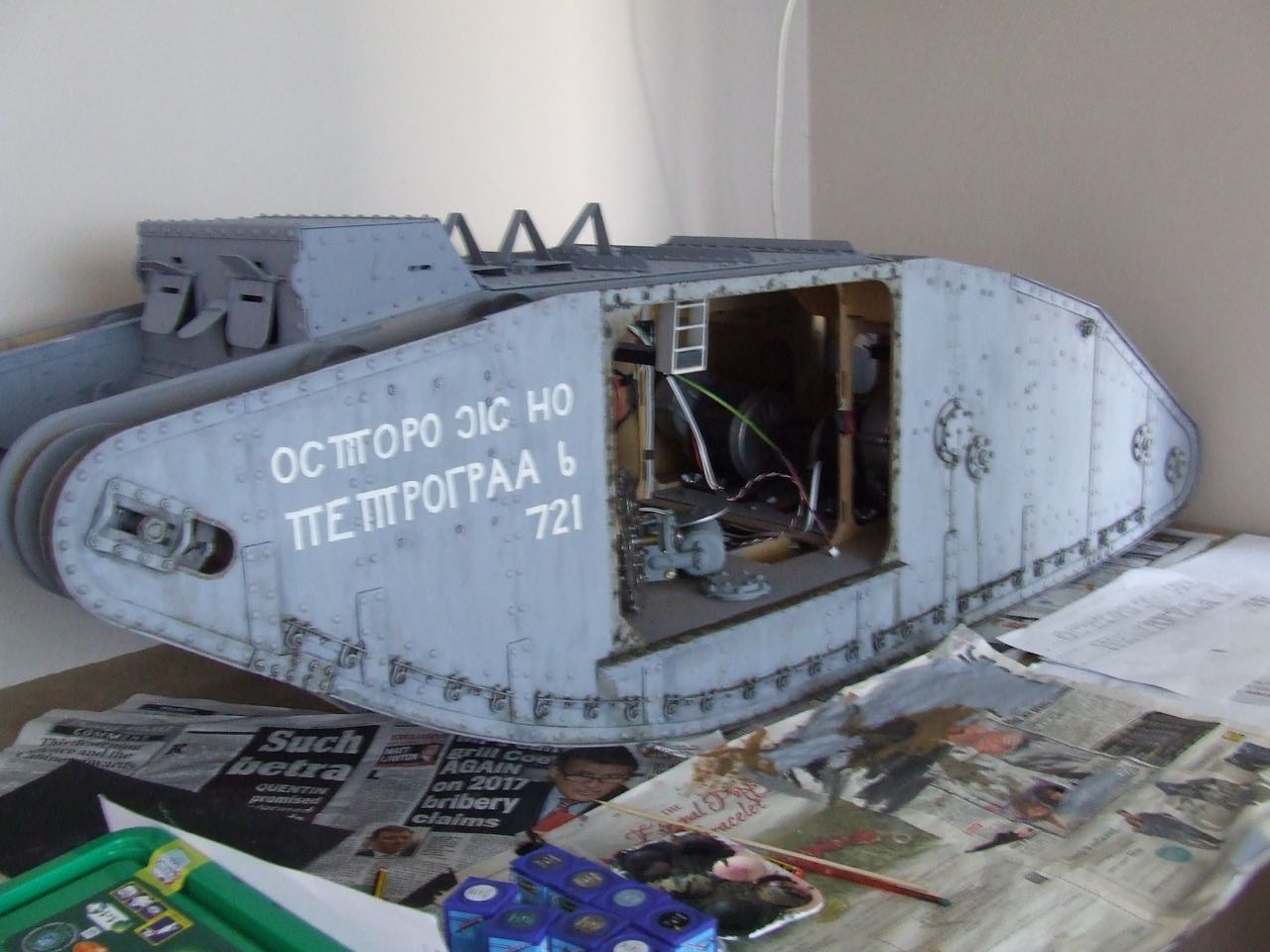 The Scheme I am going with is as they left the Factory. It is an all over grey primer with some very badly written Russian Cyrillic on the sides. The cover story for the 'Landships' was that they were being built as motorised water tanks. The Russian writing was to throw the spy off even more by hopefully making them think they were a gift to Petrograd in Russia.