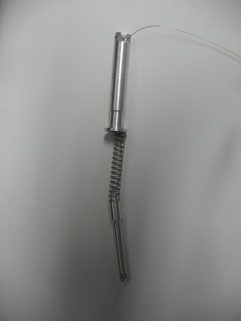 I can see how it works now I have had a look. Servo arm connected to a wire, the wire runs through a sleeve and is connected to the inner cylinder. Activated the servo and the arm pulls the wire, the wire pulls the inner piston into the outer one. Release the servo and the spring pushes the piston back out.