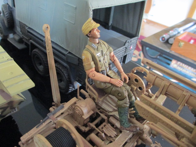 Post came yesterday and brought the last crewman for the Flak 36. He came with the same basic base and Sturmgewehr ( which I found a use for ;o) I equipped him with a cap and did some contortion exercises and got him seated. Flak crew is all present and accounted for. Pics: